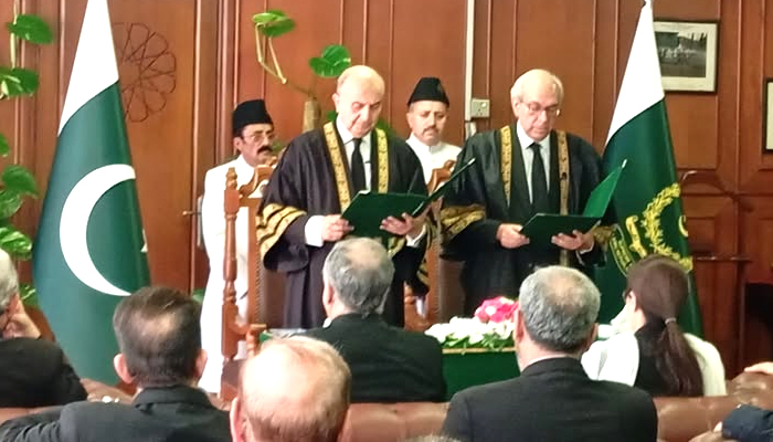 تفصیلات کے مطابق حلف برداری کی تقریب سپریم کورٹ آف پاکستان اسلام آباد کے ججز بلاک میں منعقد ہوئی، جس میں جسٹس منیب اختر نے جسٹس منصور علی شاہ سے قائم مقام چیف جسٹس پاکستان کا حلف لیا۔