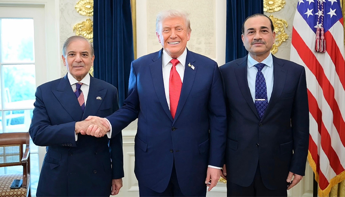 واشنگٹن میں امریکی صدر ڈونلڈ ٹرمپ نے وزیر اعظم شہبازشریف اور آرمی چیف فیلڈ مارشل عاصم منیر کا پرجوش خیر مقدم کیا، وائٹ ہاؤس کے اوول آفس کے دوستانہ ماحول میں ہونے والی بیٹھک ایک گھنٹہ 20 منٹ تک جاری رہی، اس موقع پر آرمی چیف فیلڈ مارشل عاصم منیر، امریکی نائب صدر جے ڈی وینس اور وزیر خارجہ مارکو روبیو بھی شریک تھے۔