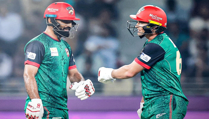 تو یہ بہتر ہونا شروع ہوئی۔ میں پراعتماد ہو کر آیا تھا، اس لیے میں اسے جاری رکھنا چاہتا ہوں۔ ٹورنامنٹ کے باقی میچوں میں جانے سے پہلے یہ پہلی نصف سنچری حاصل کرنا اچھا ہے، کچھ بہت اچھی ٹیمیں ہیں۔”شکست پر غور کرتے ہوئے، دبئی کیپیٹلز کے کپتان، داسن شناکا نے کہا:”میرے خیال میں آج ہم گیند اور بلے دونوں سے اپنے معیار کے مطابق نہیں تھے۔ ہمیں اپنی لائن اور لینتھ پر قائم رہنے کی ضرورت ہے۔ 150-160 یہاں کا پار اسکور ہے۔ امید ہے کہ ہم اگلی بار بہتر منصوبوں کے ساتھ آئیں گے۔”مختصر اسکور:ڈیزرٹ وائپرز نے دبئی کیپیٹلز کو چار وکٹوں سے شکست دیدبئی کیپیٹلز 20 اوورز میں 150/8 (رومن پاول 39، محمد نبی 29، شایان جہانگیر 19، نور احمد 25/2، ڈیوڈ پین 26/2، خذیمہ تنویر 35/2)ڈیزرٹ وائپرز 19 اوورز میں 151/6 (آندریز گوس 58، فخر زمان 26، ڈین لارنس 19 ناٹ آؤٹ، وقار سلام خیل 18/2، اسکاٹ کیری 36/2)پلیئر آف دی میچ: آندریز گوسڈی پی ورلڈ آئی ایل ٹی ٹوئنٹی سیزن 4 کے ٹکٹ ٹکٹنگ پلیٹ فارم ورجن میگاسٹور سے خریدے جا سکتے ہیں ۔