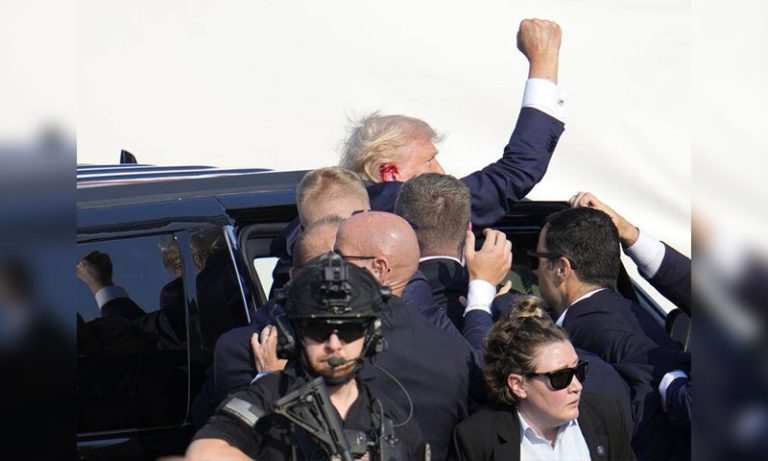 تاہم ٹرمپ تقریر کے دوران گولیاں چلتے ہی نیچے جھک گئے اور ریلی میں بھگدڑ مچ گئی، چند ہی لمحے بعد ڈونلڈ ٹرمپ کھڑے ہوئے، اپنا مکا ہوا میں لہرایا ، اس وقت ان کے دائیں کان پر خون کے نشانات دکھائی دے رہے تھے، فوراً سیکرٹ سروس کے اہلکار ٹرمپ کو اپنے حصار میں لے کر موقع سے روانہ ہوگئے، واقعہ کے بعد ریلی فوری طور پر ختم کردی گئی۔