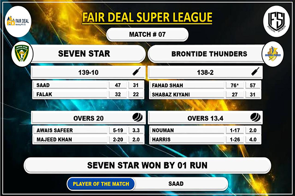 فیئر ڈیل سپر لیگ سیون سٹار نے دو میچ جیت لیے